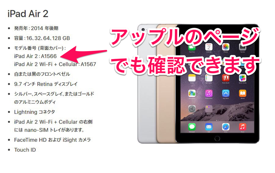 Appleのサイトで型番(モデル番号)を検索すると、お客様のお持ちのiPadの種類が判別可能です。型番(モデル番号)A1566はiPad Air2となります。