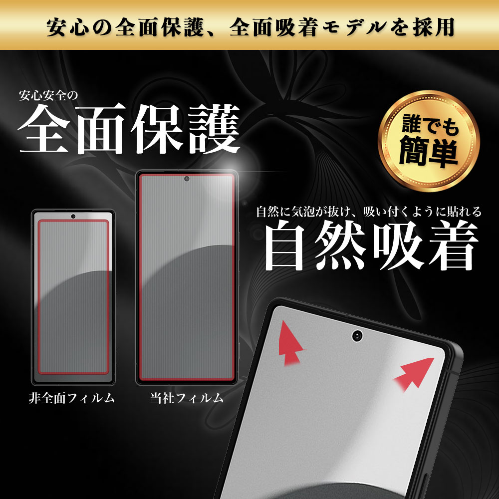 【全面保護、全面吸着タイプ】ガラスフィルムが強くても全面を保護しなければ意味が有りません。Hy+(ハイプラス) ガラスフィルムは全面保護モデル!また、タッチ感を損ねることのない全面吸着を採用。フィルムを貼ると自動的に吸着していくので貼り付けもとても簡単です。