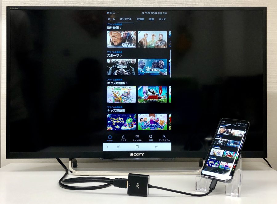 AmazonプライムビデオはAmazonプライム会員向けのVODサービスです。Amazonプライム会員になるとこのAmazonプライムビデオもご利用可能になります。料金は可変動ではありますが、動画配信サービスの中で最安値です。HDMI変換アダプタ(HY-TCHD4)に接続してAmazonプライムビデオアプリを立ち上げるとこのように映し出しがされました。Amazonプライムビデオは再生を行うと強制的にスマホ画面が横向きの表示となります。そのため、ミラーリングの映し出しも横長(大画面)表示となり、縦長画面での視聴は出来ない仕様となっていました。