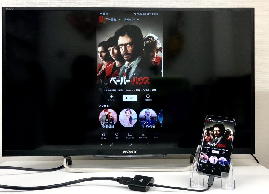いつでもどこでも動画を楽しむことができるのはスマホの活用法の一つだと思います。ただ、長時間スマホ画面を眺め続けると目が疲れる・肩が凝るだけではなく、お子さんの視力を心配している親御さんも少なくないのではないでしょうか。スマホの画面は以前に比べて大きくなってはいますが、やはりテレビの大画面に映し出して見たいと感じます。スマートテレビではなくても、ミラーリングで定額制動画配信サービスいわゆるVOD(ビデオ・オン・デマンド)をテレビで見ることができるかを試してみました。なお、HDMI変換アダプタ(HY-TCHD4)は4Kに対応していますので、4Kテレビをお持ちの方はぜひお試しください。