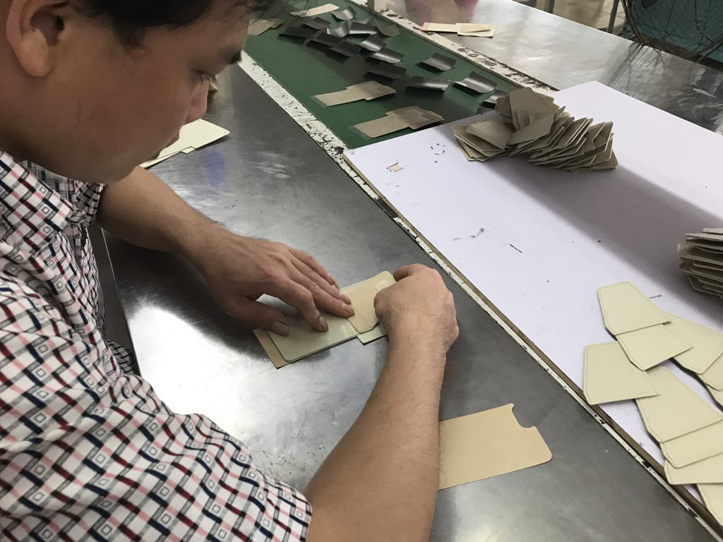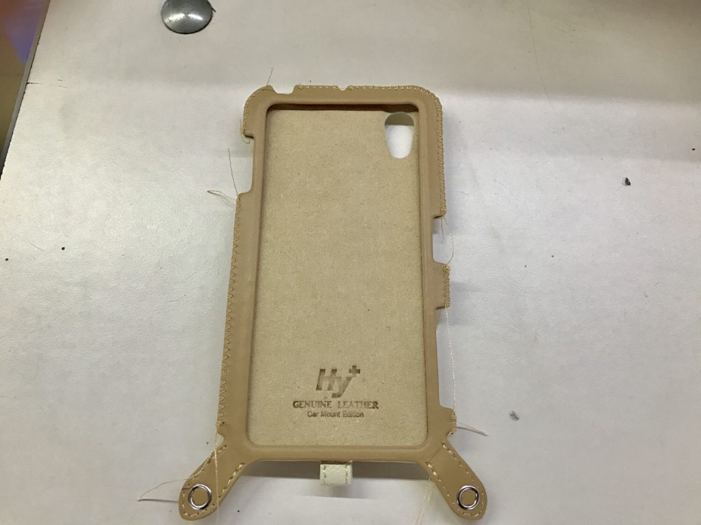 ハイプラスのカーマウントプレート内蔵 本革レザーケースの生産風景