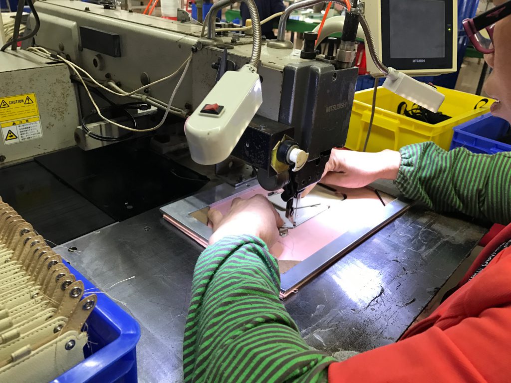 最終工程のケース表面と裏面の縫い合わせ加工です。