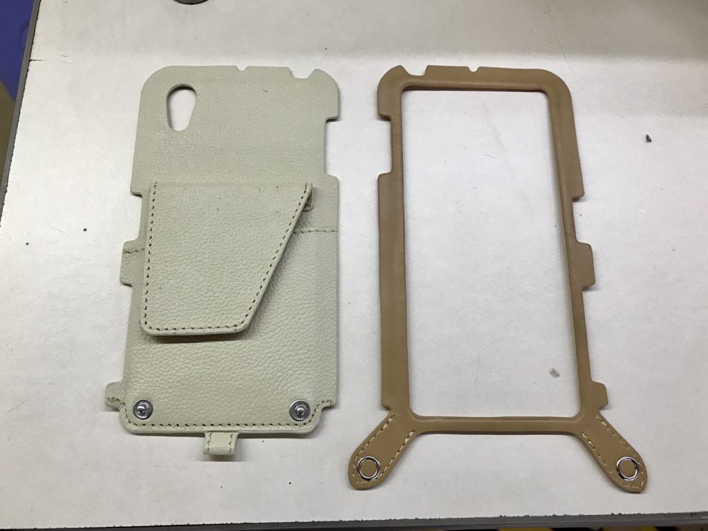 表面はスマホの画面サイズに合わせ切り抜きを行い、切り抜いた側面箇所に本革素材と同色の色付け加工を行います。色付け加工後は1日間乾燥させます。