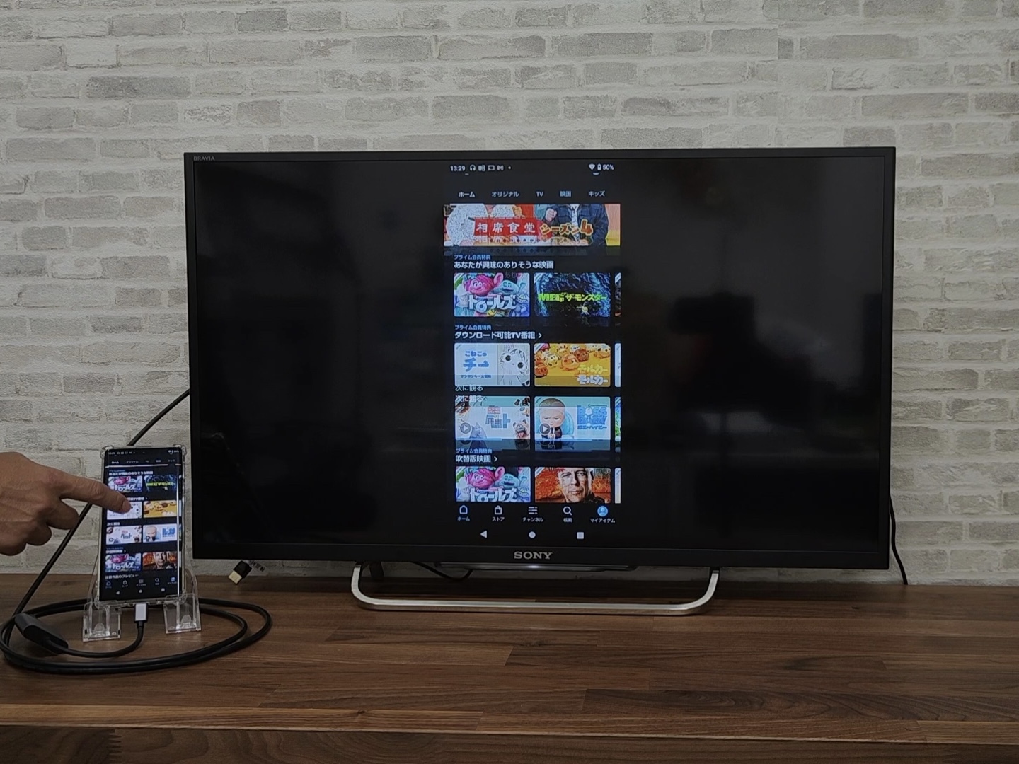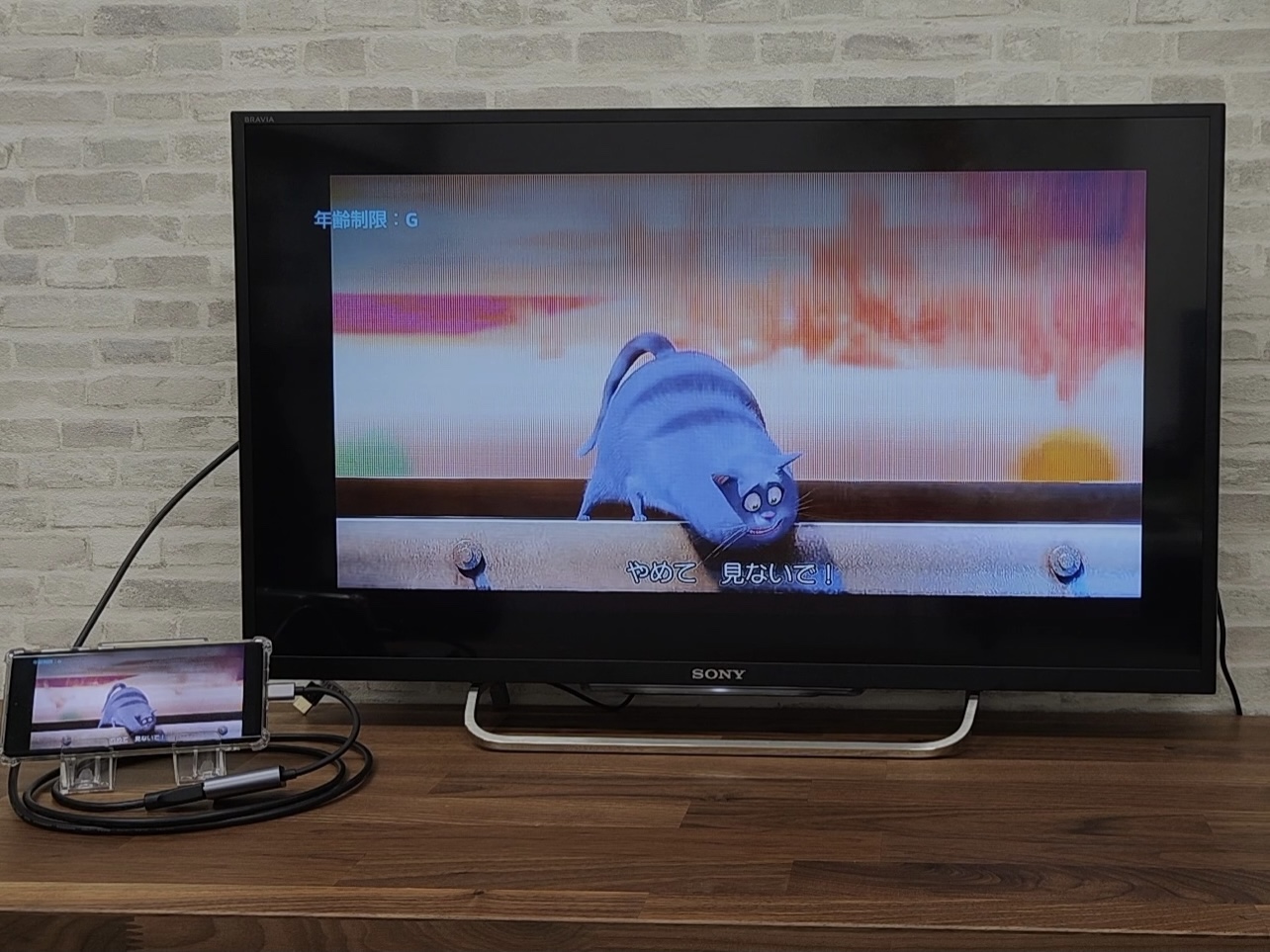 続いてAmazonプライム・ビデオをテレビ出力してみました。キッズ向けやお笑いの作品が充実していて、ダウンロード視聴と2人までの同時視聴が可能な点もメリットだと思われます。本編を再生すると、自動でスマホ画面が横向きの表示となり、ミラーリングの映し出しも横向きの表示となります。画面のサイズに自動でトリミングされ、字幕も表示されました。