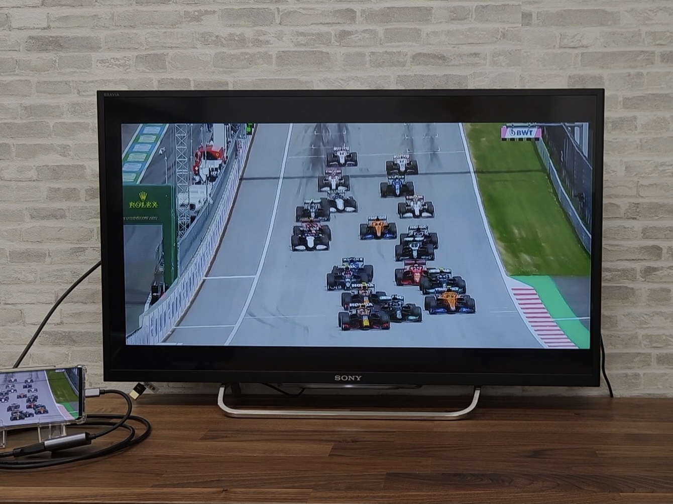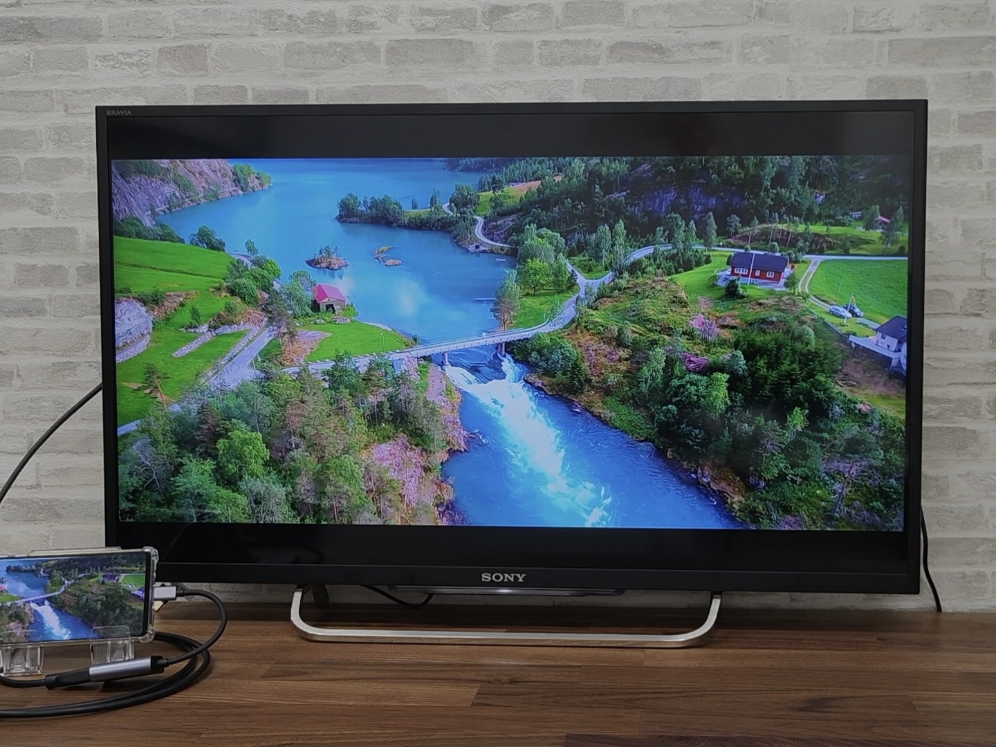 AQUOS R6とHDMI変換アダプタを接続すると、テレビにスマホの画面が映し出され接続は完了です。