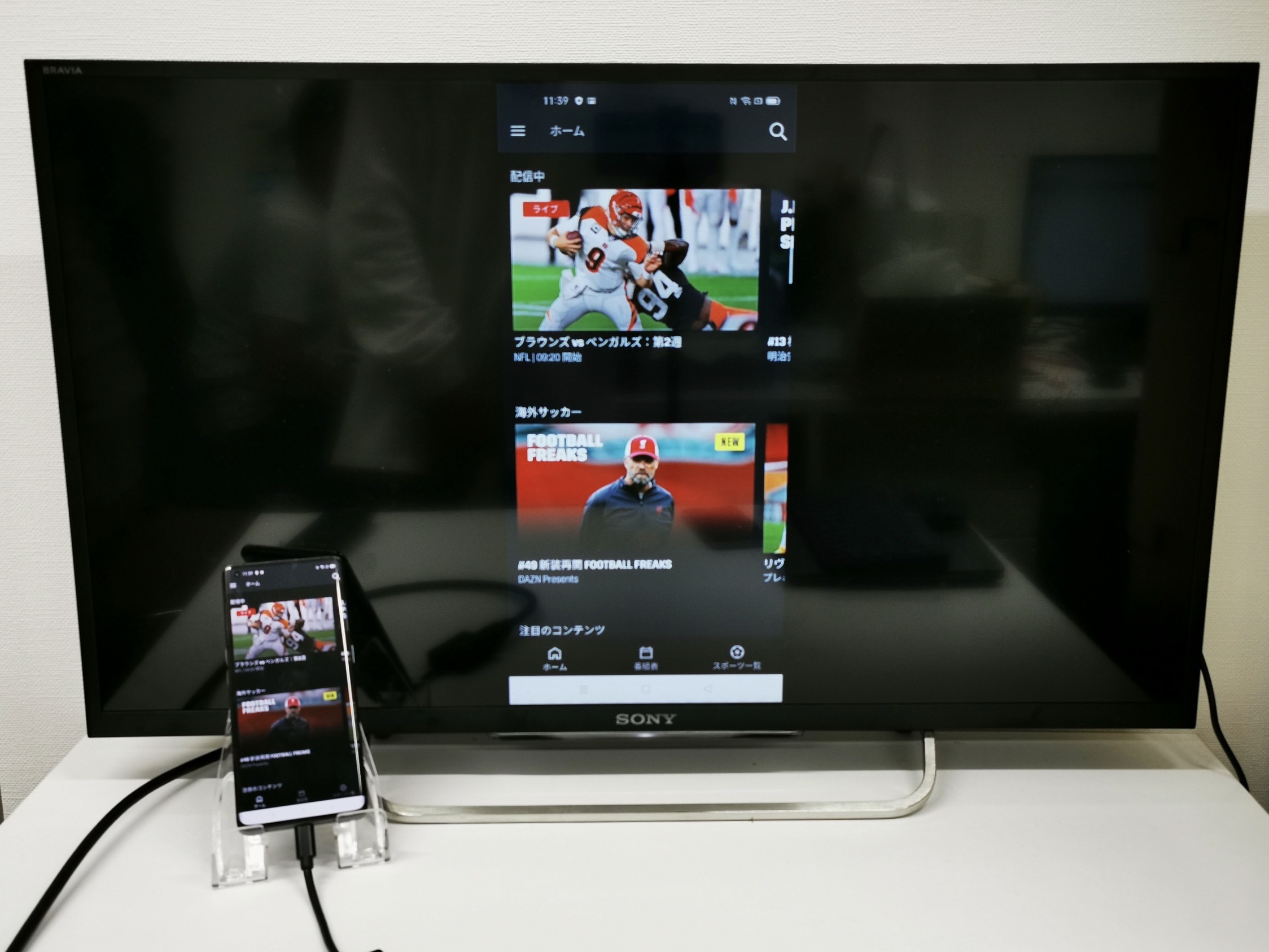 次にテレビ出力をしたのはスポーツ配信サービスのDAZN(ダゾーン)です。海外サッカー、F1、メジャーリーグ、プロ野球を主に配信されているサービスです。DAZN(ダゾーン)はアプリ側でのフルサイズボタンがなく、出力される大きさは一回り小さめとなっておりました。