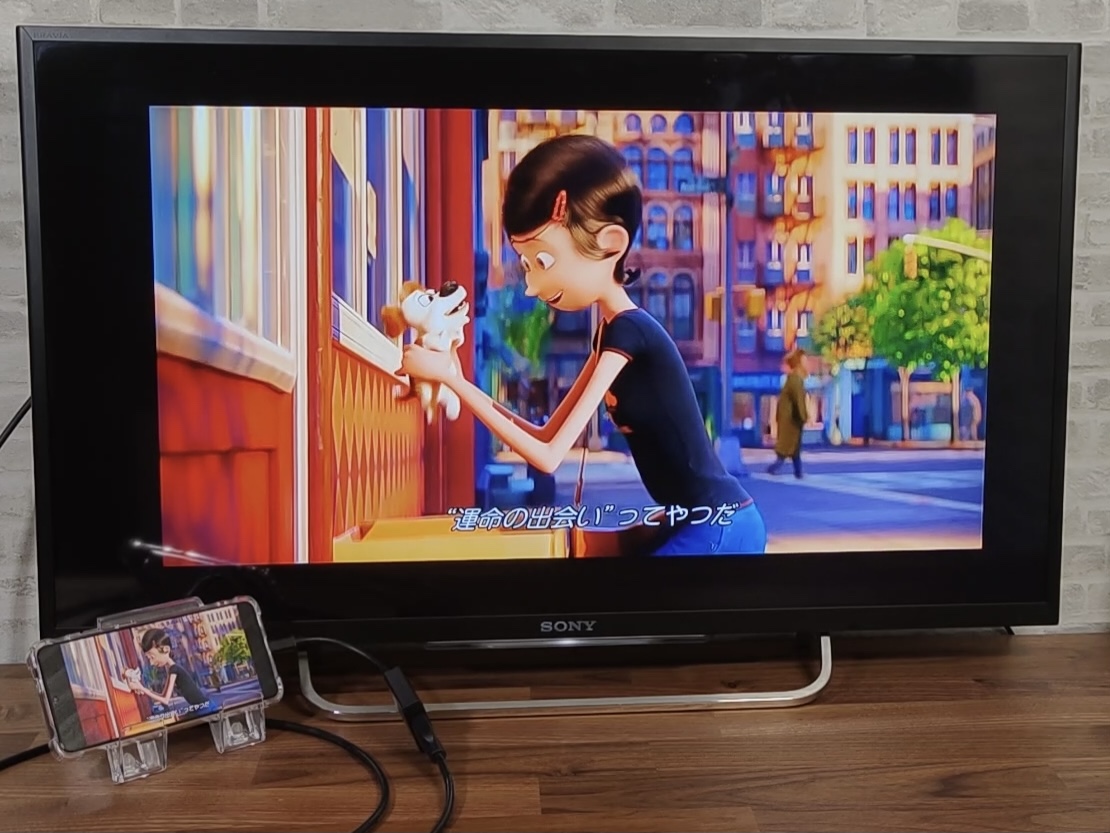 最後に、Amazonプライム・ビデオをテレビ出力してみました。キッズ向けやお笑いの作品が充実していて、ダウンロード視聴と2人までの同時視聴が可能な点もメリットだと思われます。本編を再生すると、自動でスマホ画面が横向きの表示となり、ミラーリングの映し出しも横向きの表示となります。画面の拡大縮小はできず、テレビ画面のサイズに合わせて自動でトリミングされ、字幕も表示されました。