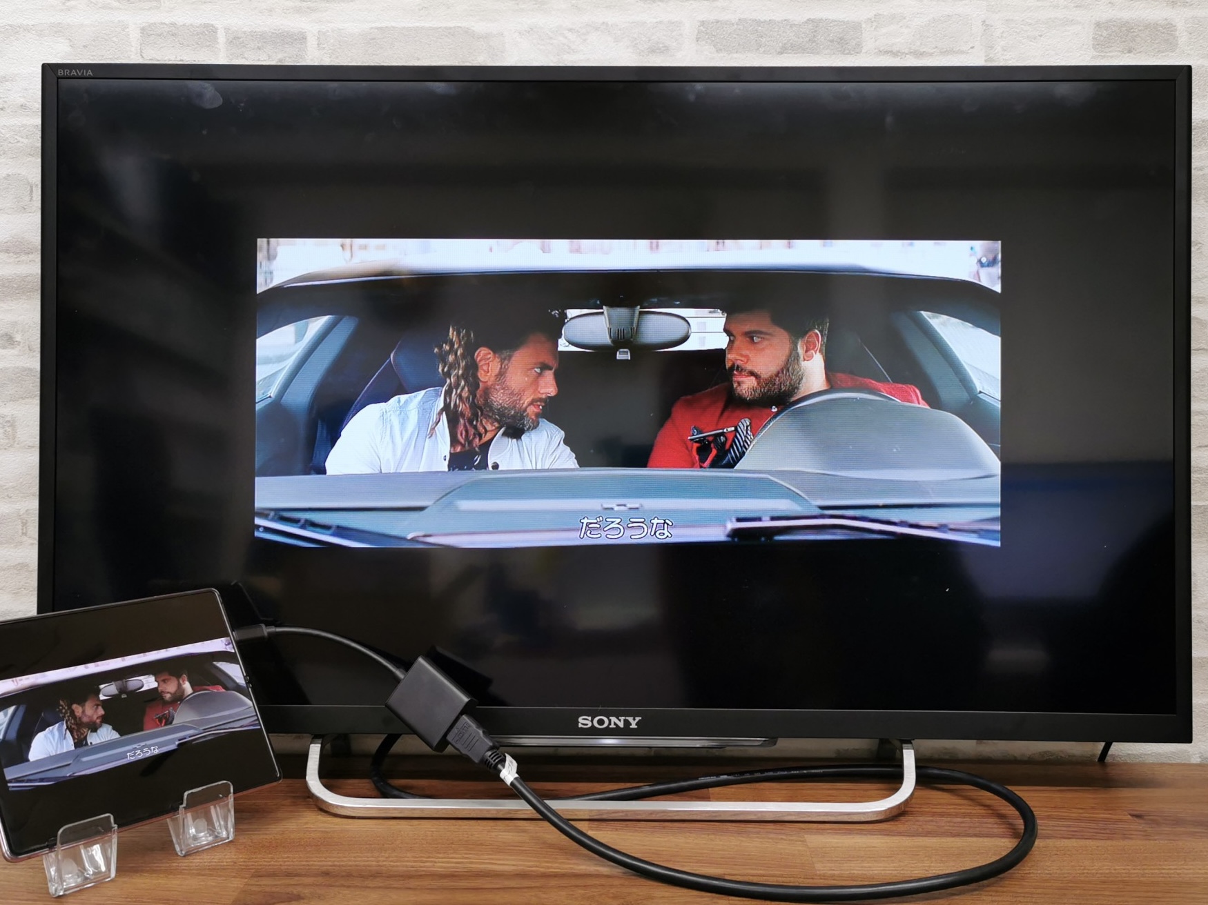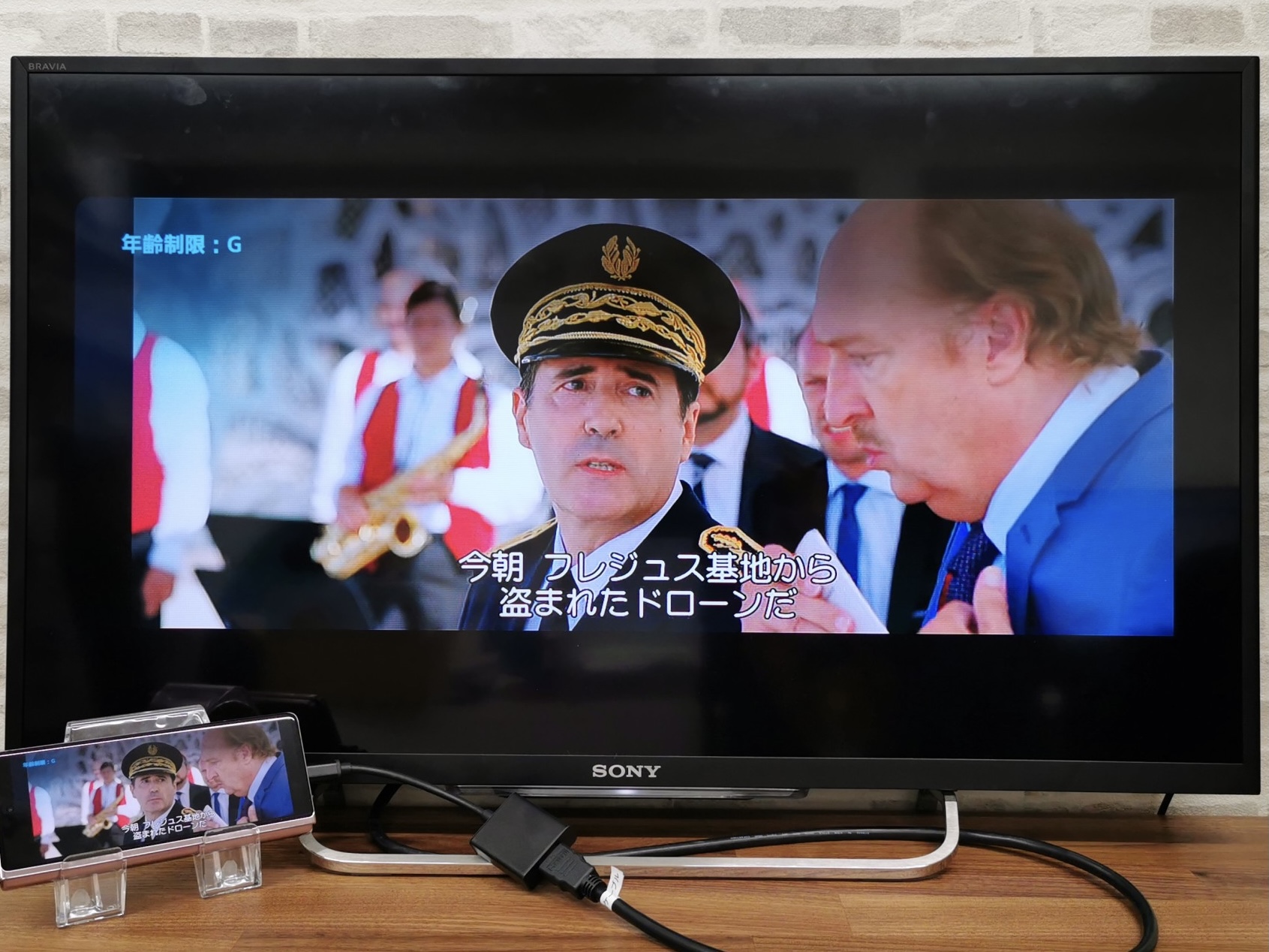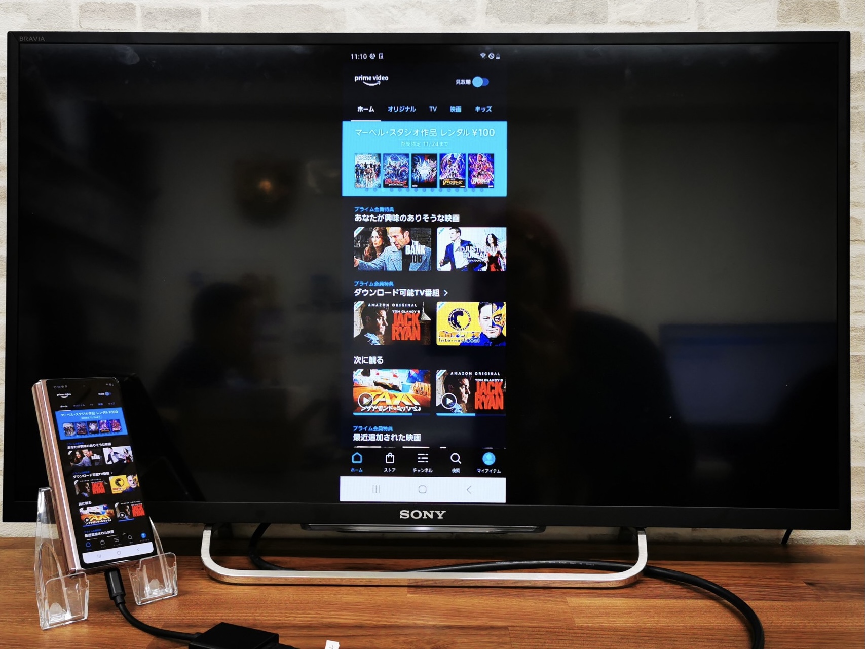 最後に、Amazonプライム・ビデオをテレビ出力してみました。キッズ向けやお笑いの作品が充実していて、ダウンロード視聴と2人までの同時視聴が可能な点もメリットだと思われます。本編を再生すると、自動でスマホ画面が横向きの表示となり、ミラーリングの映し出しも横向きの表示となります。画面のサイズに自動でトリミングされ、字幕も表示されました。