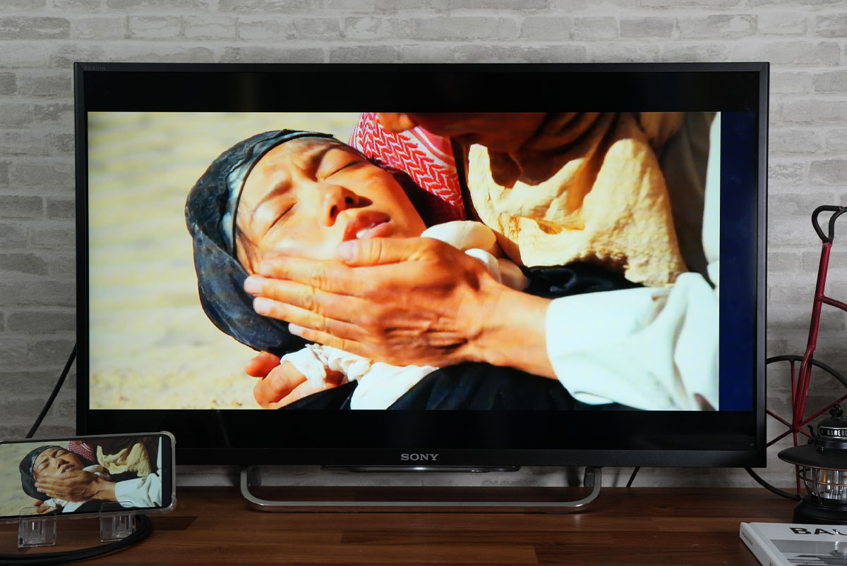 続いてAmazonプライム・ビデオをテレビ出力してみました。Amazonプライム会員に入会するとプライム会員限定ビデオも見ることが可能です。スポーツイベントやプライム会員限定ビデオも充実しています。また、ダウンロード視聴と2人までの同時視聴が可能な点もメリットだと思われます。本編を再生すると、自動でスマホ画面が横向きの表示となり、ミラーリングの映し出しも横向きの表示となります。画面のサイズに自動でトリミングされ、字幕も表示されました。